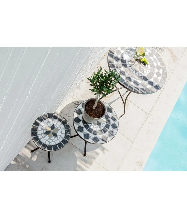 Wer sein Herz an den südländischen Lebensstil verloren hat, wird irgendwann auch an einem entsprechenden Möbelstück nicht vorbeikommen. Besonders typisch sind Accessoires mit kunstvollen Mosaiken, die im Mittelmeerraum und Nordafrika eine jahrhundertelange Tradition haben. Im Stil dieser alten Handwerkskunst wurde auch der Dehner Mosaik-Blumenhocker Diana gefertigt, den wir Ihnen hier präsentieren. Die Platte aus kleinen Mosaiksteinchen in dezenten Grau-/Braun-/Beigetönen zeigt ein klassisches Stern-Muster, zu dem das schlicht elegante Metallgestell perfekt harmoniert. Haben Sie schon einen Platz im Blick, an dem sich der Dehner Mosaik-Blumenhocker Diana in seiner ganzen Schönheit präsentieren kann? Ob im Wohn- oder Esszimmer, im Eingangsbereich des Hauses oder im Wintergarten – der Mosaik-Blumenhocker Diana wird überall sofort die Bewunderung Ihrer Besucher erregen. Holen Sie sich mit dem Dehner Mosaik-Blumenhocker Diana gleich ein bisschen mediterranes Lebensgefühl zu sich nach Hause und präsentieren Sie Ihre Blumen und Pflanzen auch nördlich der Alpen im südländischen Stil!