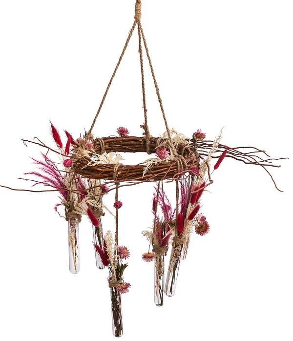 Sie schätzen schicke Dekorationen in Ihrem Zuhause und wollen sich nun einen besonders originellen Hingucker zulegen? Dann wird Ihnen der Kranz mit Glas-Vasen aus dem Hause Dehner sicher gefallen. Dieses Schmuckstück begeistert nicht nur an Festtagen mit seinem ansprechenden Aussehen, sondern verzaubert Ihr Heim das ganze Jahr über mit seinem stilvollen Erscheinungsbild. Der Kranz selbst ist aus natürlichen Zweigen per Hand gebunden, was ihn besonders rustikal, aber auch einmalig wirken lässt. Mithilfe der praktischen Kordel können Sie ihn rasch an Ihrem gewünschten Ort an der Decke aufhängen, ganz gleich, ob über dem Esstisch, im Flur oder im Wintergarten.