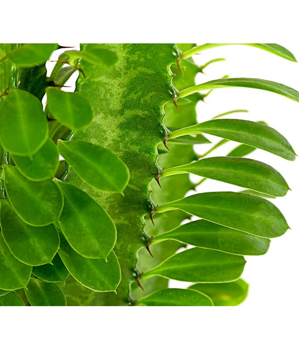 Das äußeres Erscheinunsbild lässt der Dreirippigen Wolfsmilch lässt darauf schließen, dass es sich hierbei um einen Kaktus handelt. Zwar hat auch der Wolfsmilch Dornen und sukkulente Eigenschaften, doch durch, den für Euphorbien typische Milchsaft, lassen sich diese Pflanzen klar von Kakteen unterscheiden. Außerdem kann man die zwei Gewächse normalerweise anhand der Blüten auseinander halten, doch die Dreirippige Wolfsmilch ist nicht blühfähig. Seinen deutschen, sowie seinen botanischen Namen hat die Sukkulente ihrem Aussehen zu verdanken, denn die grün, gemusterten Zweige haben immer drei ‘Rippen‘, an deren äußeres, die Dornen sowie die schmalen, kleinen Blätter sitzen.