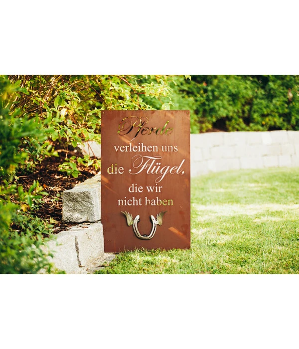 Sie lieben Pferde und möchten das auch in Ihrem Garten zeigen? Dann liegen Sie mit der Metall-Gedichttafel Hufeisen von Ferrum goldrichtig. Sie ist mit einem liebenswerten Spruch versehen, der Ihre Wertschätzung für Pferde schon auf den ersten Blick zeigt. Passend dazu wurde die Tafel mit einem Hufeisen geschmückt, das mit kleinen Flügeln bezaubert. Diese auffällige Applikation ist eine wundervolle Ergänzung, die dem Schild das gewisse Etwas verleiht. Jeder Pferdenarr wird verstehen, warum Sie sich für dieses schöne Accessoire in Ihrem Garten entschieden haben.