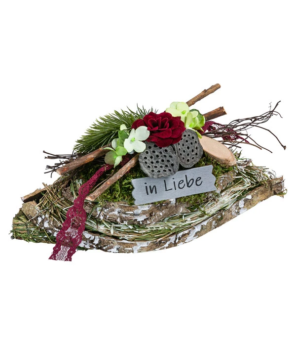 In Zeiten des Abschieds kann man die Erinnerung an einen geliebten Menschen mit einem würdevollen und einfühlsamen Grabschmuck auf besondere Weise bewahren. Das Grabgesteck Bristol von Dehner bietet Ihnen genau das, eine stille Möglichkeit, Ihre Gefühle auszudrücken und Ihrer Liebsten zu gedenken. Das formvollendete Gestell aus Rinde, Heu und Moos bildet die Grundlage für dieses einzigartige Grabgesteck. Es ist kunstvoll mit täuschend echt wirkenden Blüten, Zweigen und weiteren Elementen bestückt, die dem Arrangement eine natürliche Schönheit verleihen. Das robuste Naturgeflecht sorgt dafür, dass das Grabgesteck Bristol wochenlang haltbar bleibt und Ihnen somit eine lang anhaltende Erinnerung ermöglicht.