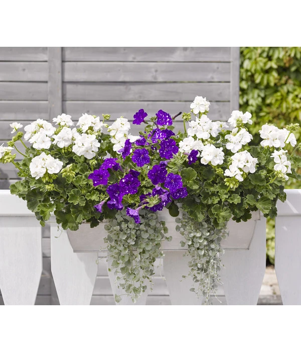 Na, wäre das nicht ein traumhafter Schmuck für Ihren Balkon? Auf den kräftig violetten Blüten erstrahlen die weißen Tupfen wie funkelnde Sterne am Nachthimmel – ein prachtvoller Anblick, der Sie bestimmt an Urlaub und entspannte Sommerabende unter dem südlichen Sternenhimmel erinnert. Die Hängepetunie ‚Night Sky‘ ist eine bei Tag wie bei Nacht strahlende Schönheit, die die Atmosphäre auf Ihrem Balkon verzaubern wird. Noch ein Tipp zur Bepflanzung Ihrer Balkonkästen: Besonders eindrucksvoll ist die Wirkung, wenn Sie Petunien-Sorten mit unterschiedlichen Blütenfarben und -formen mixen. Zu den blau-weißen Blüten der Hängepetunie ‚Night Sky‘ lassen sich zum Beispiel ausgezeichnet reinweiße, gelbe oder pinkfarbene Petunien kombinieren.