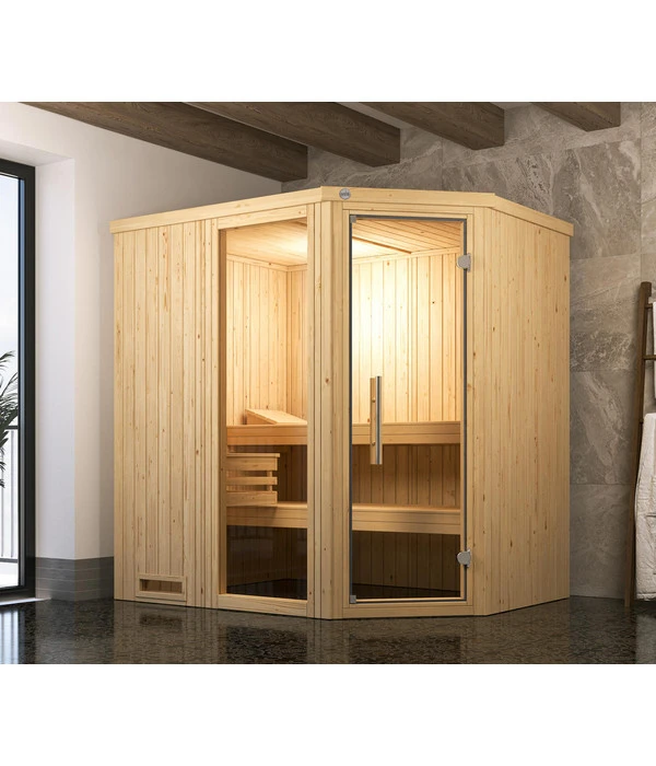 Weka Ecksauna Varberg mit Glastür und Fenster