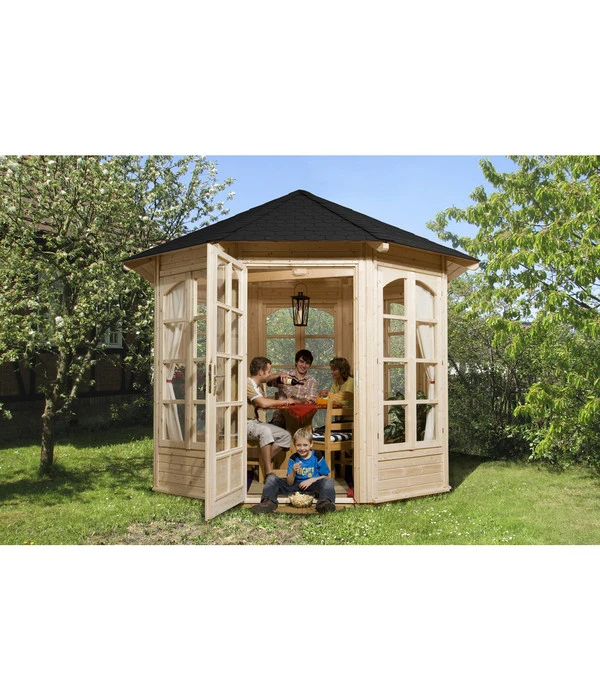 Die Wände dieses Gartenhauses sind aus hochwertigen, Nordischen Hölzern gefertigt; der Boden sowie das Dach bestehen aus 19 mm starken Massivholz-Elementen. Die Dachkonstruktion des Weka Pavillon 234 B ist sehr hochwertig und aufwendig verarbeitet. Das garantiert Ihnen eine schöne Optik und erleichtert gleichzeitig den Aufbau des Daches. Als Ersteindeckung erhalten Sie eine ausreichende Menge Bitumendachpappe. Um dem Gartenpavillon aber den letzten optischen Schliff zu geben, können Sie es auch mit hübschen Dachschindeln eindecken. Sie wohnen in einer schneereichen Gegend und fragen nach der Stabilität des Daches? Keine Sorge: Die Schneelast beträgt 125 kg pro Quadratmeter beim Weka Pavillon 234 B.