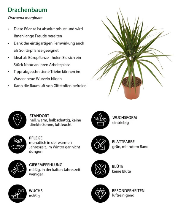 So ein Drachenbaum ist absolut unkompliziert in der Pflege und daher auch für Anfänger eine schöne Option. Selbst wenn Sie bisher kaum Berührungspunkte mit Zimmerpflanzen hatten, werden die Pflänzchen schnell wachsen und gedeihen. Nötig dafür sind nur ein paar Punkte wie Standort und Gießverhalten. Gegossen werden möchte ein Drachenbaum nur mäßig, wünscht sich aber dennoch einen luftfeuchten, hellen und warmen Standort. Direkte Sonne mag er nicht, Halbschatten dagegen ist geeignet. Monatliche Düngergaben während der Wachstumsperiode unterstützen die Pflanze beim Größerwerden, im Winter benötigen Ihre neuen Mitbewohner keinen Dünger.
